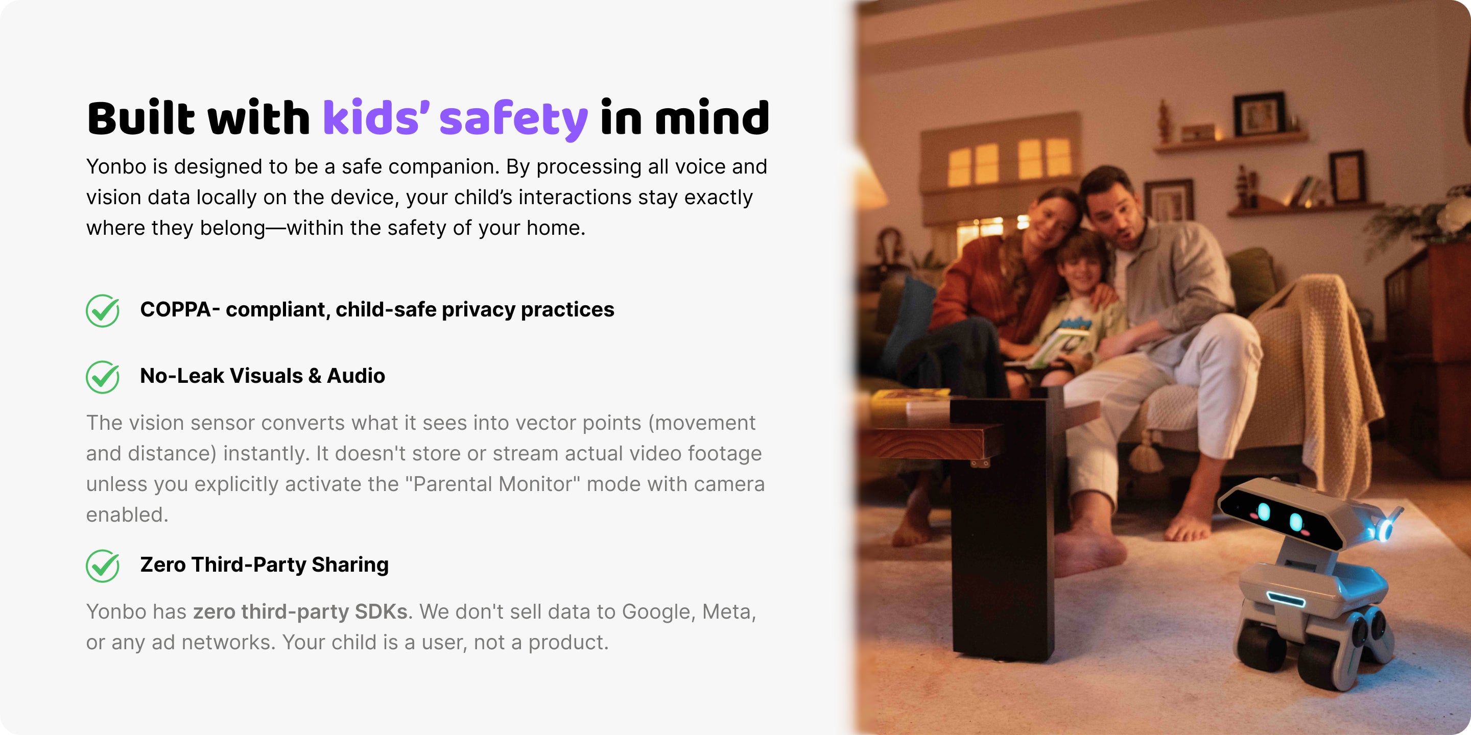 Yonbo keeps a local list of safety keywords. If it detects concerning words, the parent app sends an alert. No audio or images are saved or uploaded.